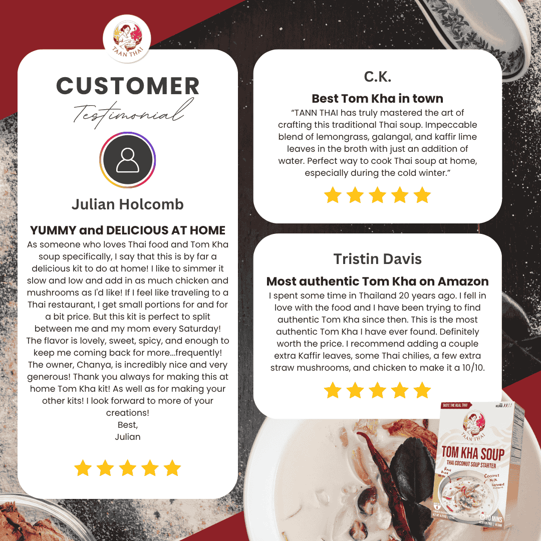 Discover authentic Thai flavor with TAAN THAI's Tom Kha Soup Starter—a Thai coconut comfort soup infused with premium dried Thai herbs and spices for an effortless gourmet experience.